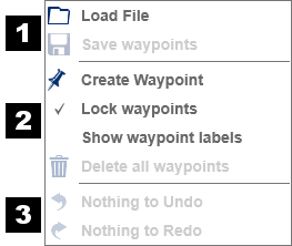 Includes options to create a new waypoint at the current mouse location, configure the way waypoints are displayed and delete all current waypoints - see Waypoints.